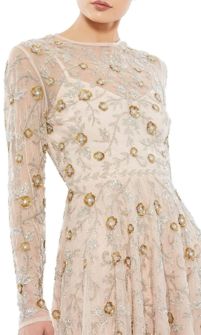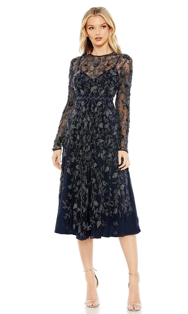 Heighten your charming appeal wearing Mac Duggal Cocktail 10799 dress. Crafted with beaded and floral embroidery that adorns the bodice framed with long sleeves, jewel neckline and a V-lining elegantly embedded that perfectly complements the illusion effect on the neckline and back. The pleated A-line skirt reveals a tea length hemline. Be the ultimate belle of the party in this gorgeous creation from Mac Duggal.