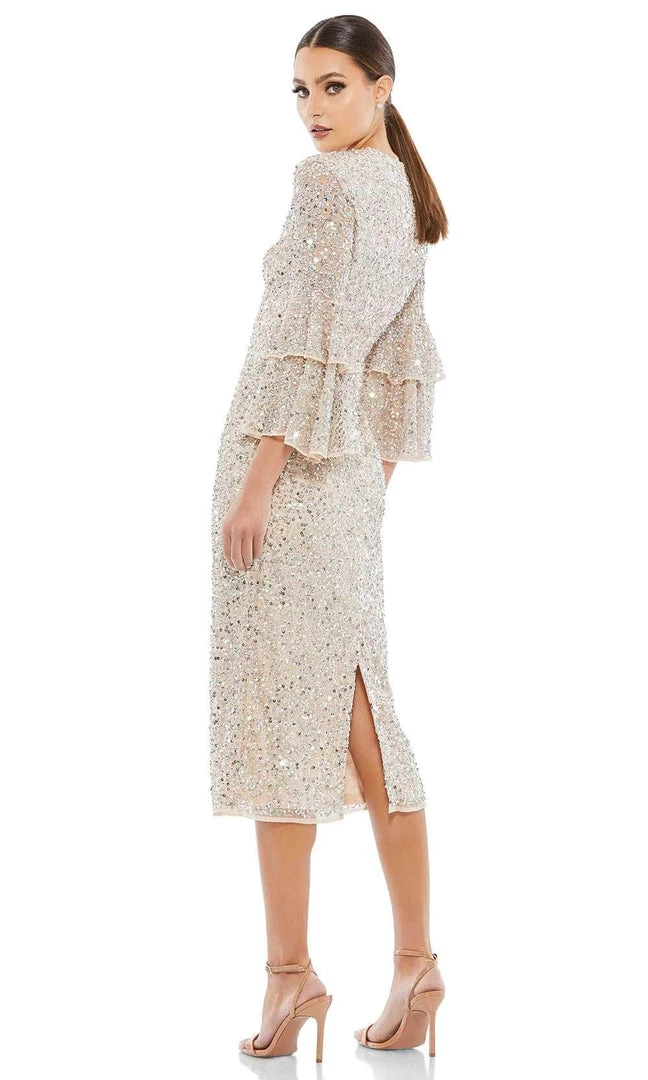 Regale a romantic and alluring style in this scintillating Mac Duggal 10802 creation. Festooned with beads and sequins hand-beaded on a mesh silhouette, this dress parades with a jewel neckline and a full back. Tailored with a partially lined bodice and skirt, this stunner flourishes sheer quarter sleeves ending in ruffles tiers. The sheath skirt as it opens with a back slit and ends with a tea length hemline. Have the crowd awestruck by the sheer beauty of this Mac Duggal masterpiece. Models are wearing the Deep Emerald, Navy and Nude colors.