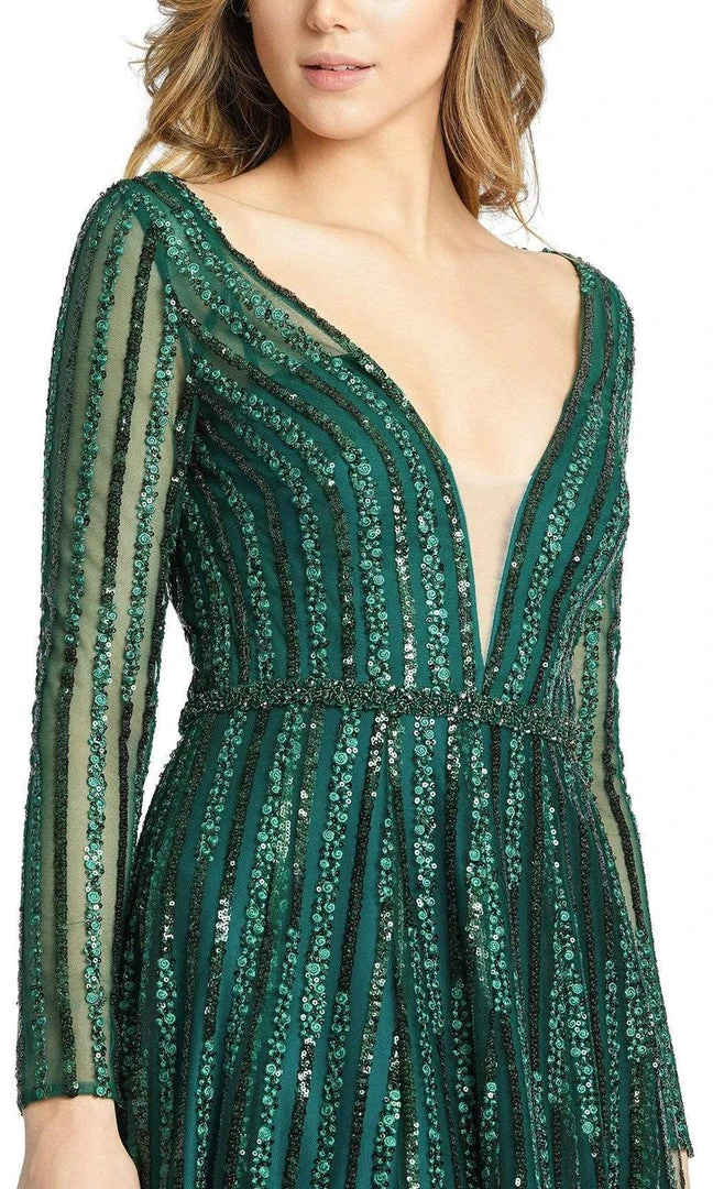 Look fantastically impressive for your next formal event in this gown by Mac Duggal 11184. Stunning beadings and intricate embellishment form a shimmering waterfall effect into the sheer silhouette of this A-line gown. Featured with an illusion deep V neckline, sheer long sleeves, and half-sheer enclosed back. The gown has fitted bodice with visible sweetheart lining, beaded encrusted natural waist and a full-length skirt. You are all set to grace a night of eloquent style and poise with this remarkably amazing gown from Mac Duggal.