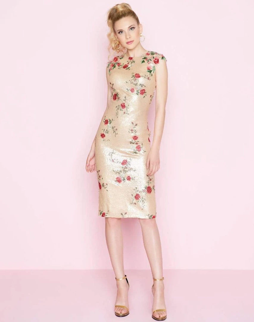 Display your feminine charm wearing this radiant sequin embellished formal dress by Mac Duggal Cocktail 40857. This radiant knee-length dress features a jewel neckline and cap sleeve in a full sequin embellished fabric. Red floral embroidery perfectly adorn this sparkling sheath ensemble with a back slit finish. This Mac Duggal number offers versatile appeal, a perfect choice for event that calls from a modest look to fabulous, from cocktail to a special occasion party.