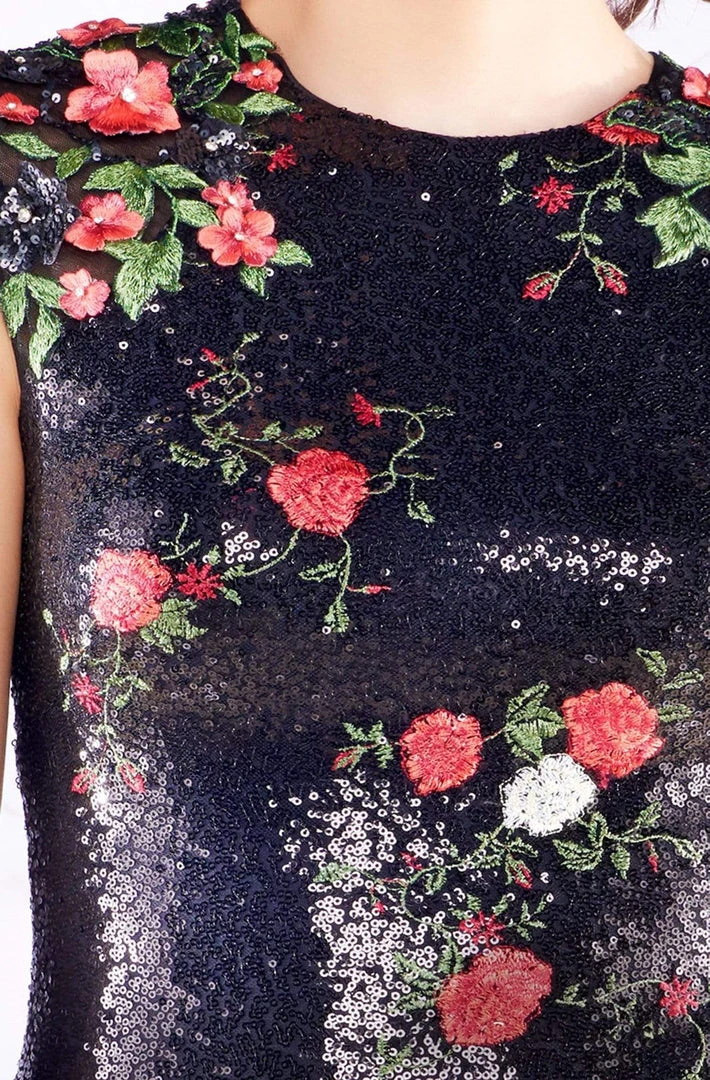 | Details: | Cap sleeves, Sequined embellished, Floral embroidery, Back slit, Back zipper closure |