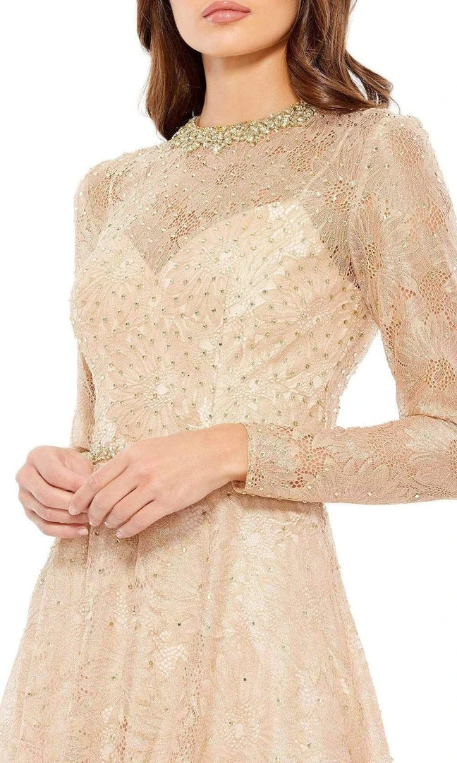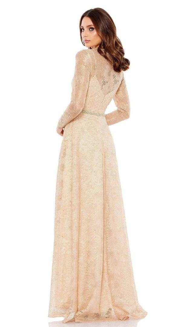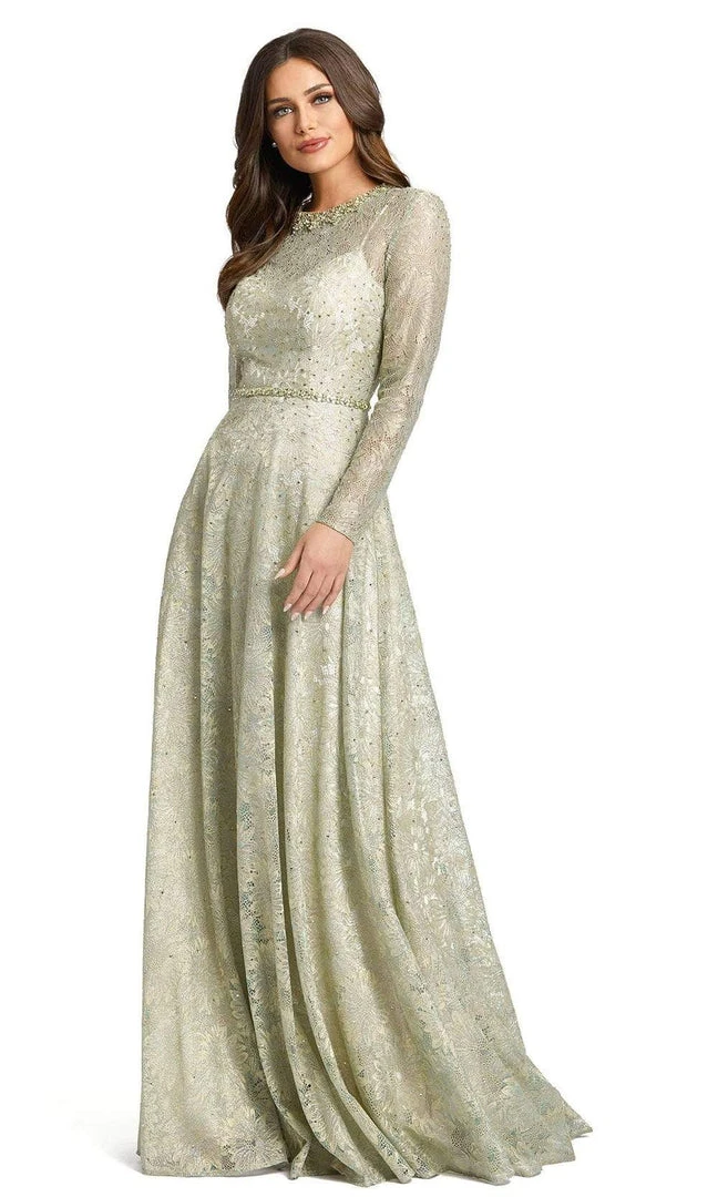 Bloom with loveliness in this detailed creation from Mac Duggal Couture 49188. Embellished with beaded embroidery, this gown shows an illusion jewel neckline with a sweetheart lining. Sheer long sleeves and a full back accent this stunner. A beaded belt is put around the natural waist while the A-line skirt dramatically flows into a full-length hemline with a sweeping train. This Mac Duggal style will let you celebrate that divine feminine beauty!