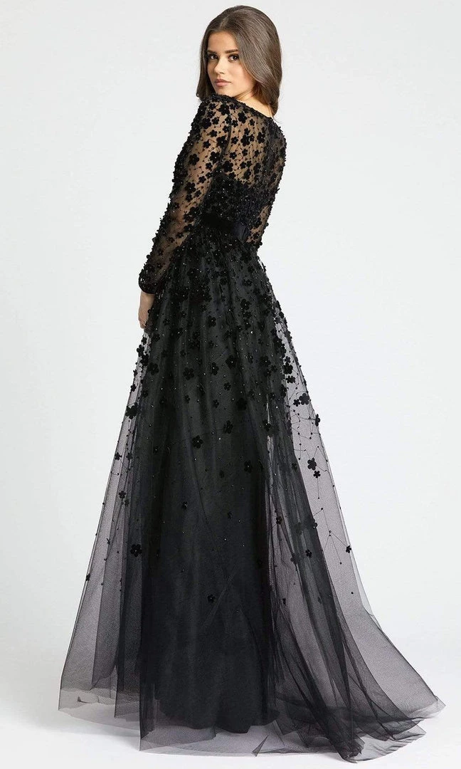 Dare to show off your style in a fashionable dress from Mac Duggal 67502. This gorgeous gown stands out with its eye-catching floral appliques. It has a plunging V neckline with sheer long sleeves and waistband. The skirt cascades in a full length A-line silhouette. Optimize the attraction of your special event in this alluring dress by Mac Duggal.