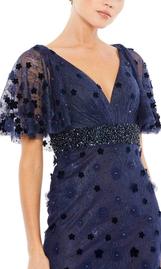Enter the hall with grace and beauty in Mac Duggal 67712. A sheath silhouette dress that parades a bell sleeves and a plunging neckline. It is embellished with floral applique throughout. The thick band is made with beads. This dress by Mac Duggal creation is so stunning and will make you the queen of the night.