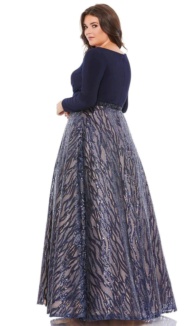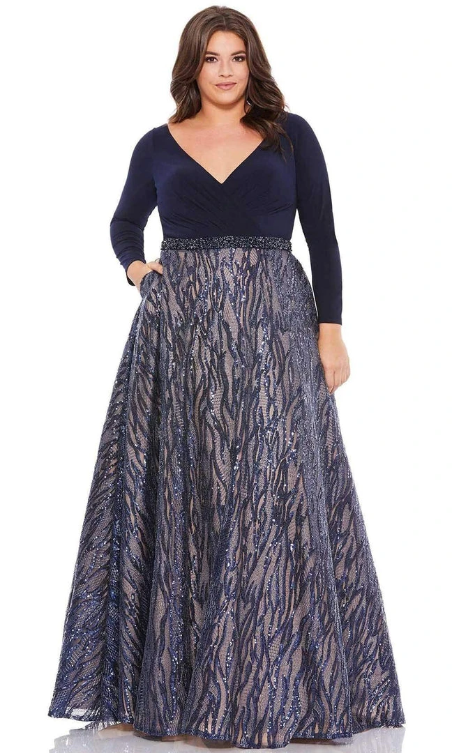 This posh party gown by Mac Duggal 67765 puts you in the spotlight. This long dress is marked by v-neck neckline and a long sleeves. It has thick band that is made with beads. The skirt is embellished with sequins throughout. Walk in glamour with this modern style of gown. Mac Duggal is your excellent choice for prom or for any special occasion when you dare to look extraordinarily fabulous!