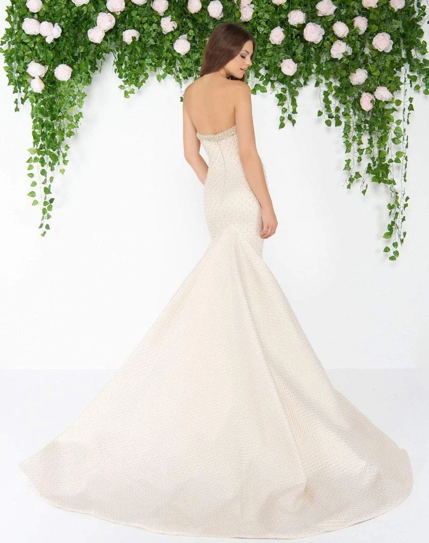 | Details: | Strapless, Embossed brocade, Beaded, Mid open back, Back zipper closure, Godet insert, Sweep train |