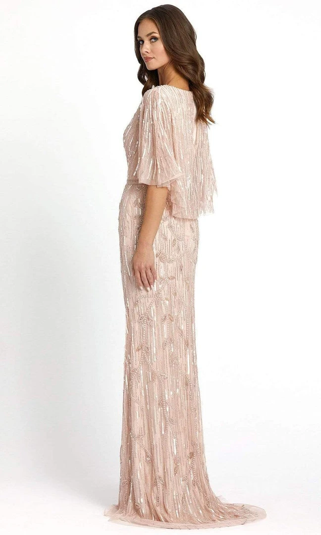 Have fun in this fashionable dress from Mac Duggal 9064. This sequined masterpiece allures in a plunging V neckline with sheer bell sleeves. The dress flourishes an elegant sheath skirt and finishes in a sweep train. Make them look in this lavish dress by Mac Duggal.
