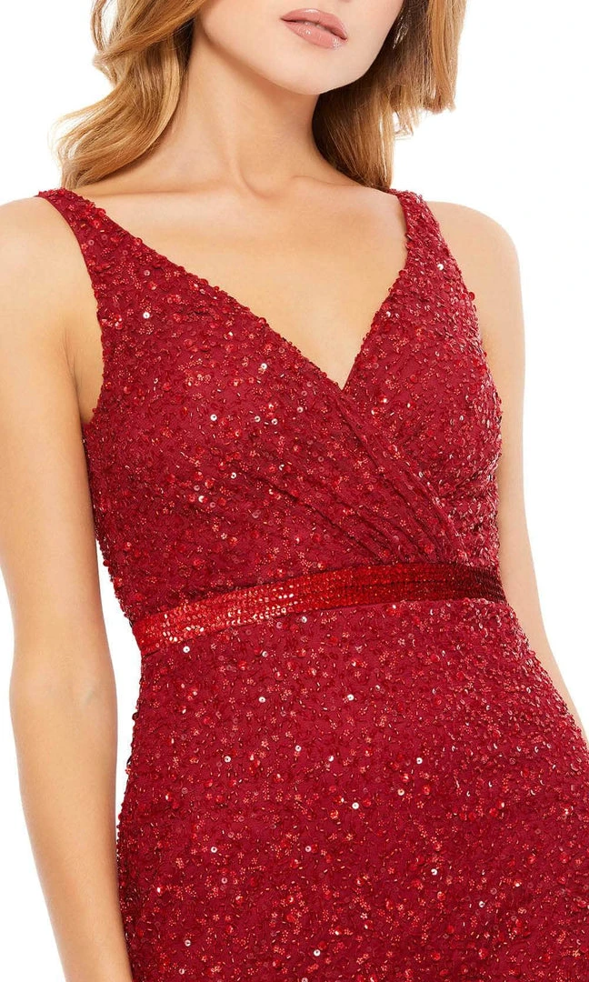 Show up in this gorgeous evening dress by Mac Duggal 9110 that has the perfect amount of glitz and glamour. Supported by thick straps, this dress displays a low-cut V-neckline in a surplice style and crusted with sequin details all over. The embellished waistband flatters the waist while a V-shaped open back with zipper closure highlights the sultriness of the dress. The skirt displays a sheath silhouette down to its full length with a high slit to finish the look. This Mac Duggal masterpiece will make sure you turn heads all night long. Model is wearing the Red color.
