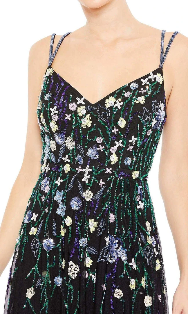 Make it a moment to shine in this Mac Duggal Couture 9172 evening dress. Adorned with intricate floral sequin appliques, this piece flatters with a sleeveless and V neckline supported with dual spaghetti straps which lead to an open back. To complete this look the pleated A-line skirt is tailored with a high-leg slit for a sexier appeal. This stunning Mac Duggal creation is sure to get you noticed.