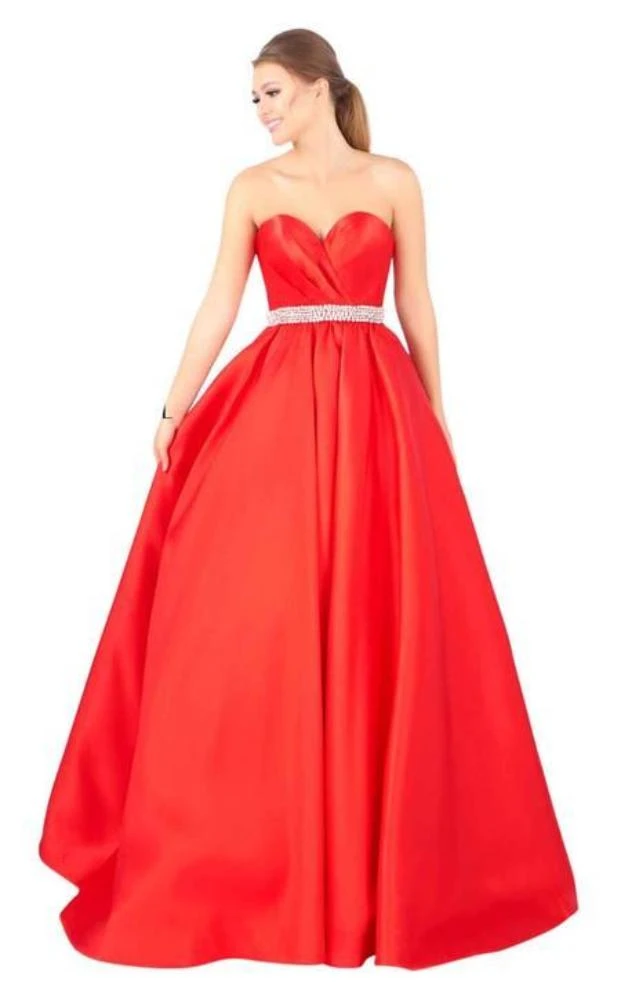 | Details: | Strapless, Pleated bodice, Rhinestone embellished belt, Full length. Back zipper closure, Side hand pocket |