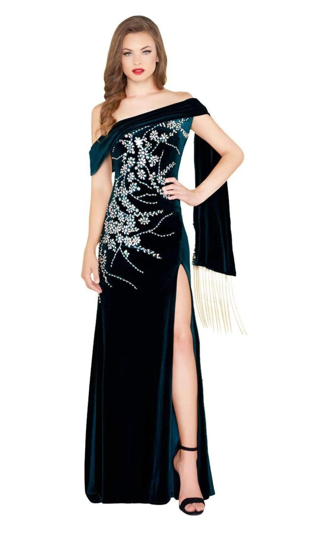 Look sophisticated and mature in this simple yet chic Mac Duggal Black white Red 12186. Shows off an asymmetric neckline with an off the shoulder drop and fringe details. This velvet dress is ornate with sparkling gemstones and forms a full length trumpet skirt with high leg slit and sweep train finish. Radiate a fresh style as you orchestrate a dramatic entrance in this radiant Mac Duggal piece.