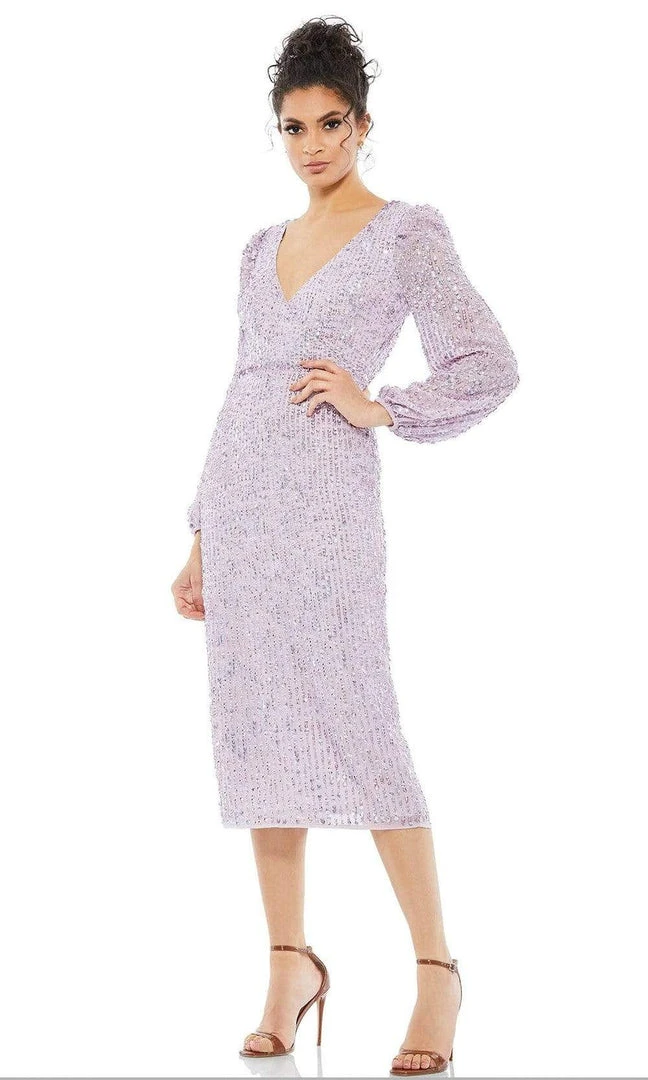 Don a style that is iridescently charming in this Mac Duggal 10764 creation. Flourishing shimmering sequins allover its length, this dress reveals a v-neckline and a full back. Accented with a back slit, the sheath skirt streams to adhere at a tea length hemline. Indulge yourself in an upscale glamour in this Mac Duggal masterpiece.
