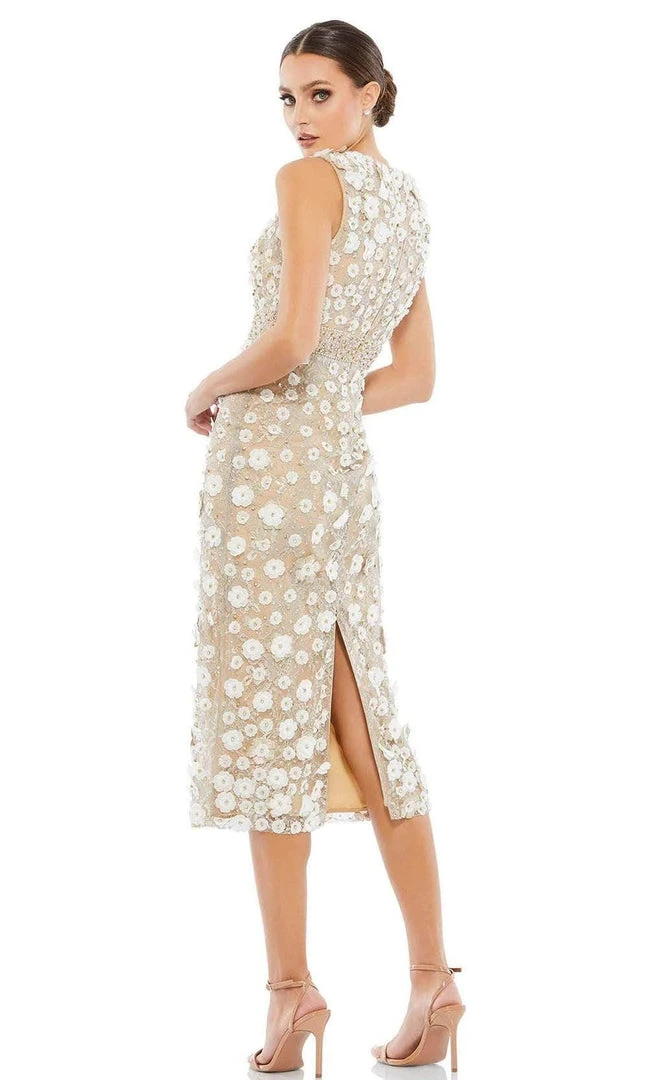 Be the definition of elegance in this Mac Duggal 67853 dress. This knee-length dress highlights a jewel neckline in a floral appliqued and beaded bodice. The skirt reveals a sheath silhouette with back slit while the back shows a full back with back zipper closure to finish off the look. Get ready to show off your glamorous side in this Mac Duggal creation. Model is wearing Ivory/Nude color.