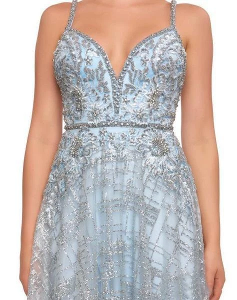 | Details: | Sleeveless, Plunging neckline, Embellishments, Fitted bodice, Dual straps, Open back, A-line skirt, Sweep train |