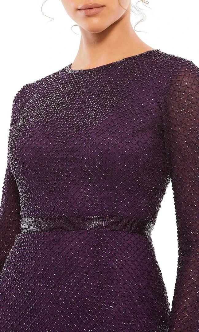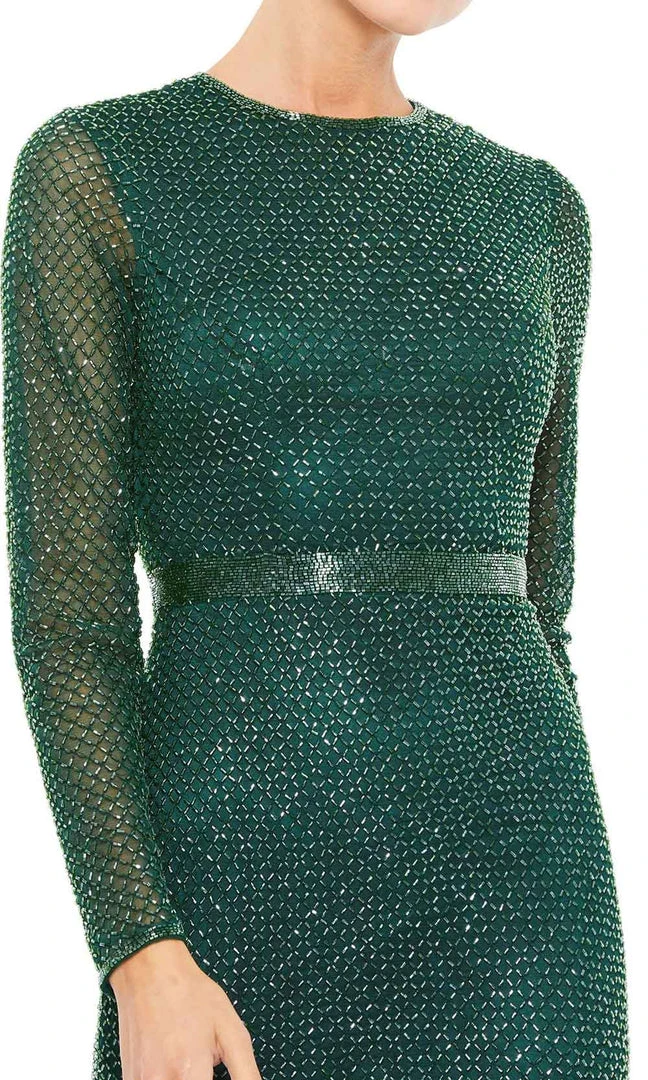 Make a lasting impression in this exquisite Mac Duggal 5056 creation. Textured with lattice rendered beadwork, this stunner shows a jewel neckline with long sleeves. Crowned with a beaded waistband and a high slit, the skirt traverses to the floor with a slit and a train. Have all eyes gravitate towards you in this Mac Duggal masterpiece.