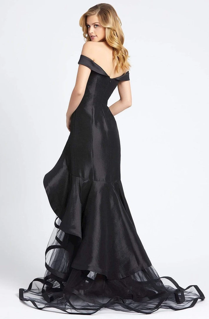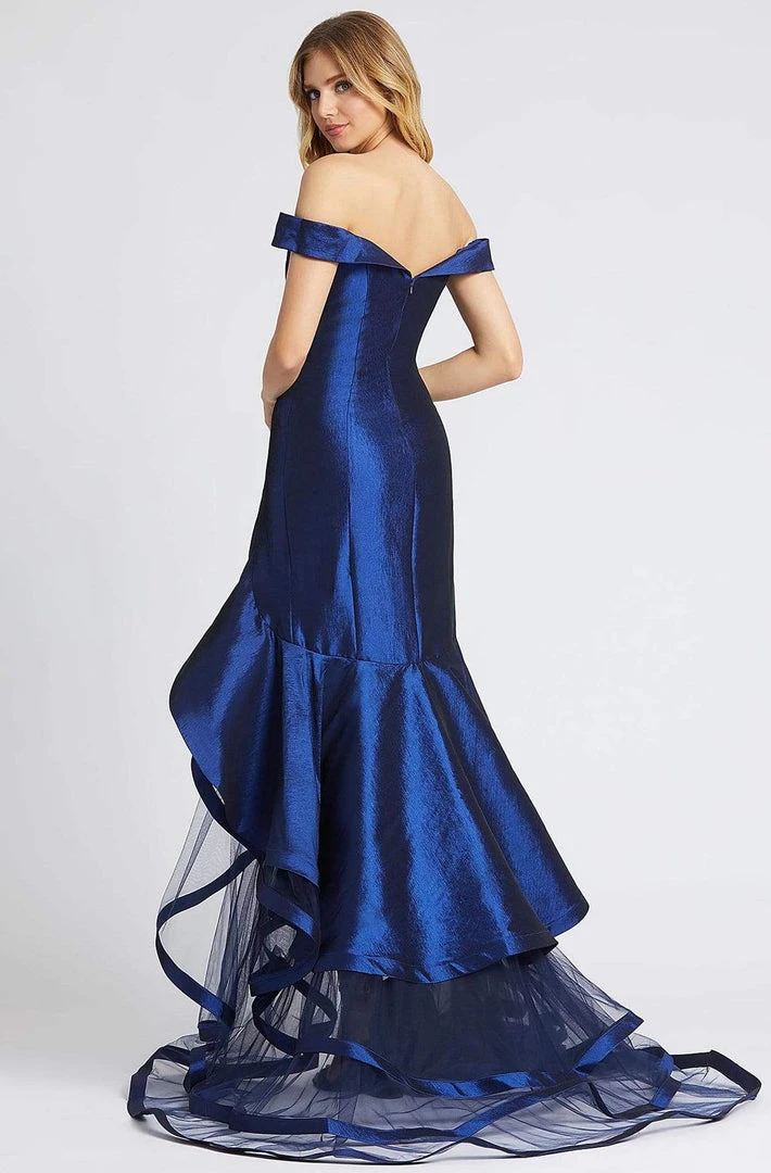 Be featured in front of the glimmering limelight in this stunning Mac Duggal 67068D creation. Sleekly designed in a Mikado fabric to create a foldover surplice, this piece flatters with an off shoulder neckline with a deep sweetheart notch. The trumpet skirt gives an asymmetrical slit as tulle ruffles down into a trailing train. Glow with an elegance of a style star in this Mac Duggal masterpiece.