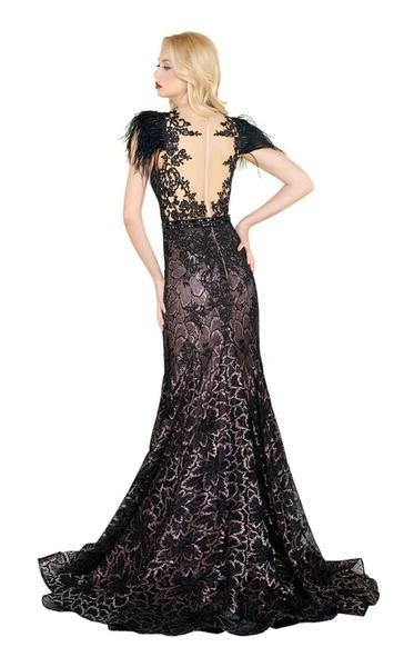 An illusion bateau neckline crowns the fitted bodice with feathers delicately hand-sewn on the outer banks of the cap sleeves. This dress is a style in iridescent nude lining with black lace, fused with diamante jet black stones and matching belt. The back offers a sheer full panel with a fabulous sweep train for that perfect finish.