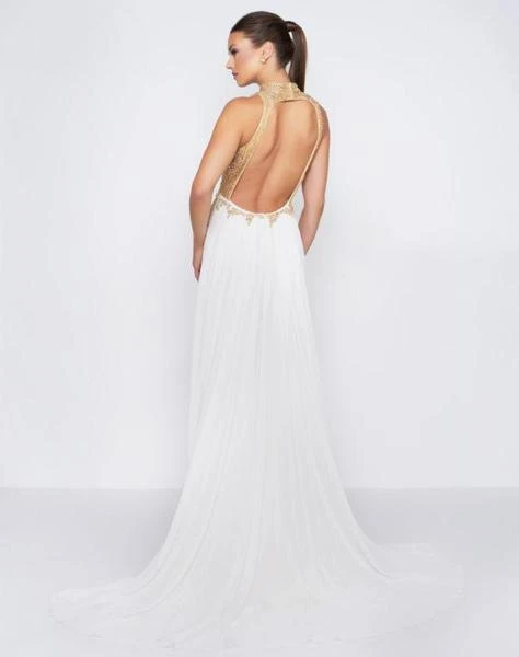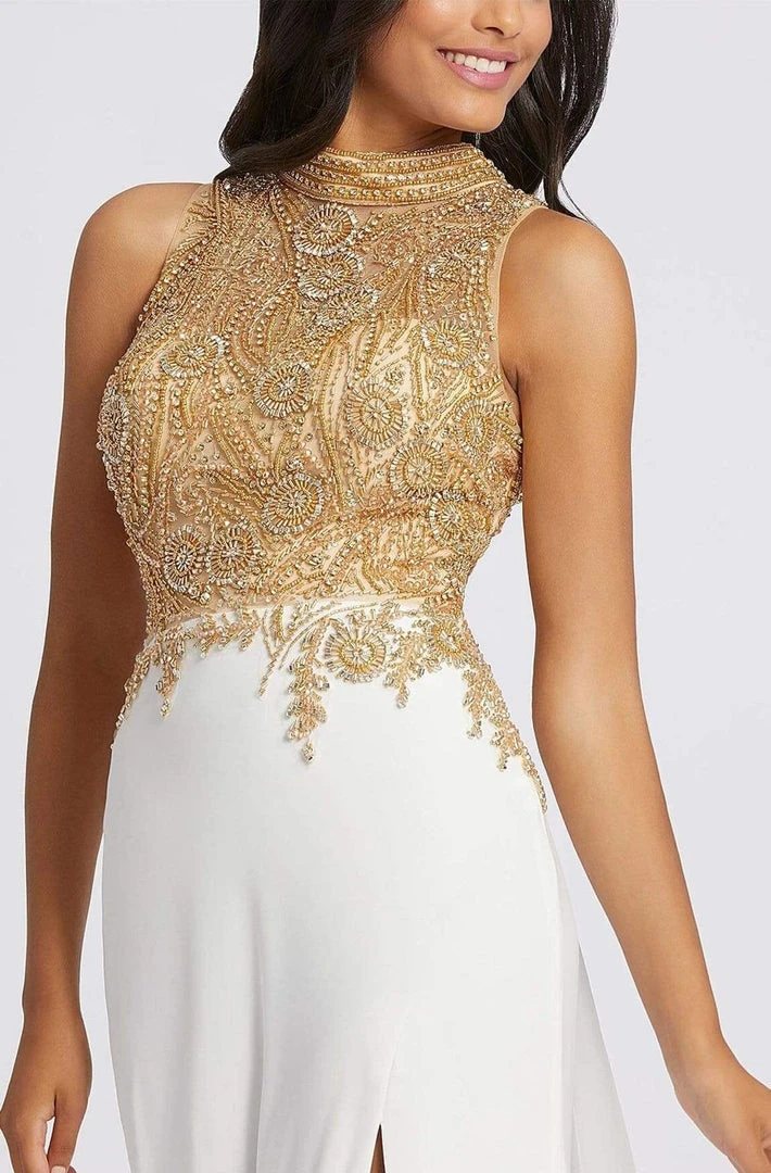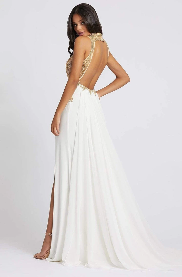 Sophisticated elegance and timeless beauty perfectly describe this lovely prom dress from Mac Duggal Prom 12106. A modest high collar embellished with dyed to match pearls, clear rhinestones and glamorous beading is just the beginning of this unforgettable gown. A swirling floral pattern, detailing runs along shoulder and illusion neckline, and then falls onto the entire bodice. Completing this fabulous prom look is the chiffon overlay skirt with a high – leg slit. This evening dress by Mac Duggal makes a lovely pageant crossover style.