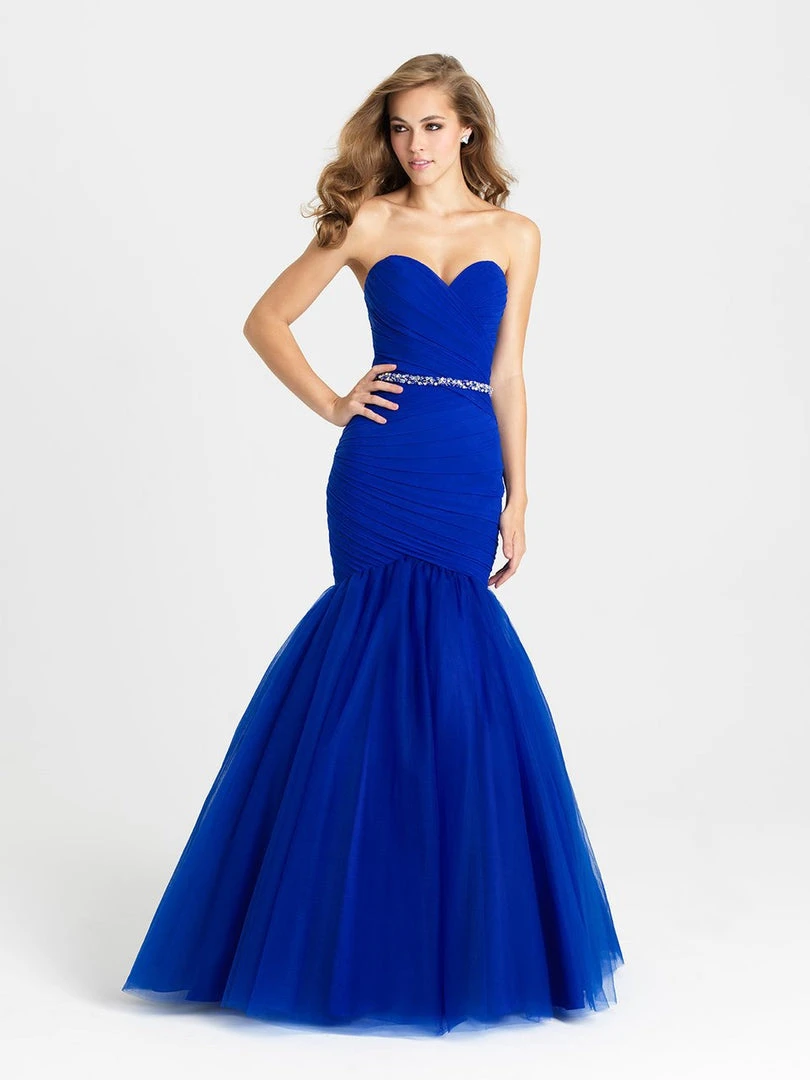 Emphasize your curves in this ruched gown, accented at the waist with a jeweled belt.