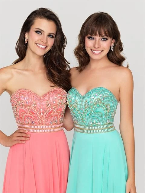 Soft hues and delicate beading pair together in this strapless chiffon gown. ?¡