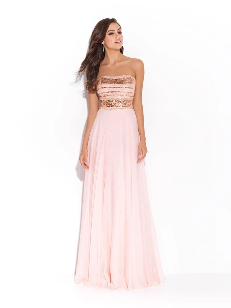 Striped sequins cover the bodice of this strapless chiffon gown.