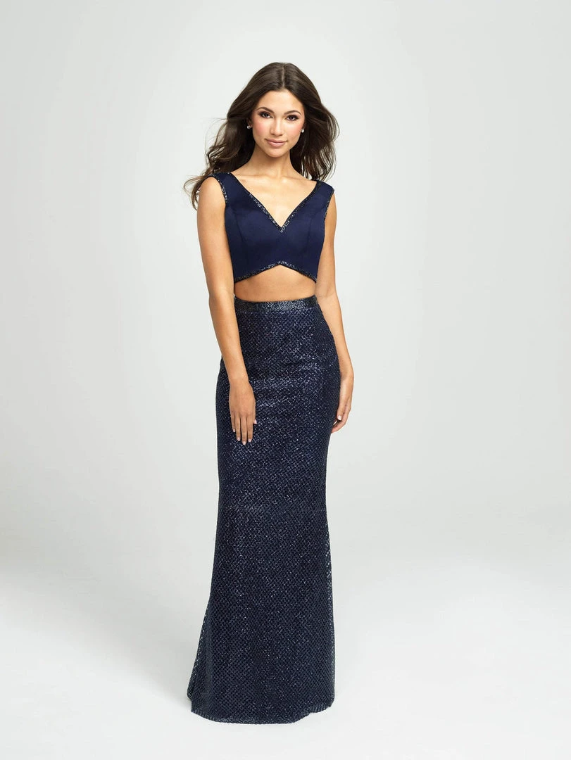 Make such a stunning impact as you glow with beauty in this Madison James 19-101 creation. Sculpted in a solid fabric trimmed with glistening beads along the edges of its peaked cropped design, this beauty shows a deep v-neckline paired with a v-open back. Embraced with a tonal beaded band along the high waist, the sheath skirt reveals a glittering crosshatch treatment that flows stunningly into a sexy full-length hem. Charm everyone with your timeless elegance and feminine allure in this Madison James masterpiece.