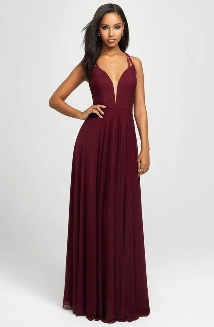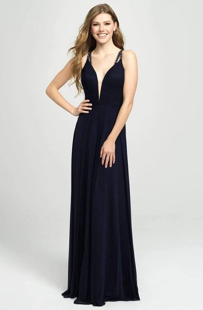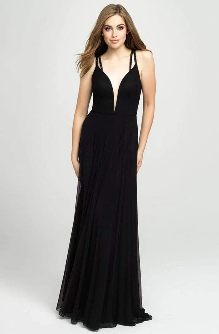Capture every heart with this gorgeous Madison James 19-152 evening gown. This regal sleeveless Prom gown fashions a fascinating deep V Illusion neckline with sheer panel and sparkling straps creating a caged effect along the back. This full-length ensemble drapes to the ground for a figure flattering and fabulous . Inspire awe at your senior prom when donned with this scrumptious piece by Madison James.