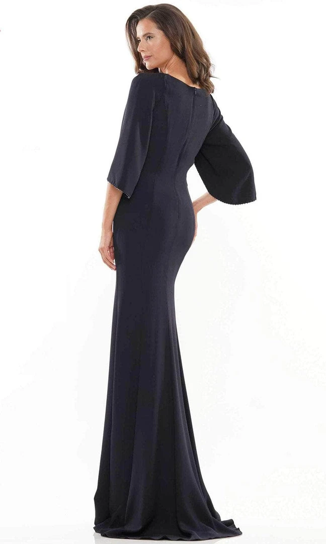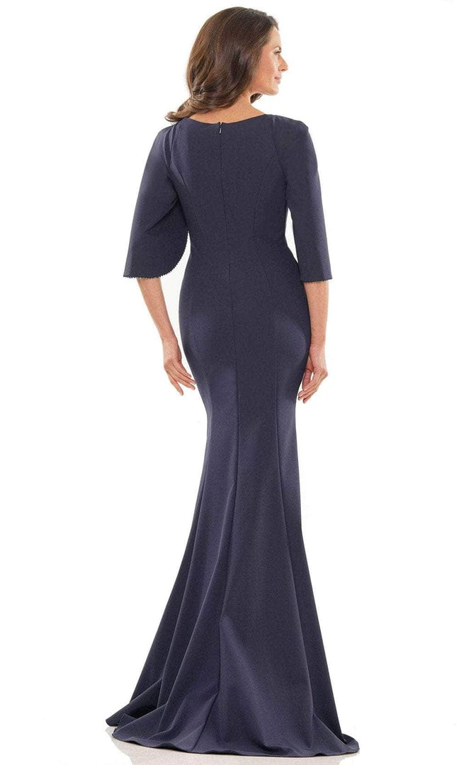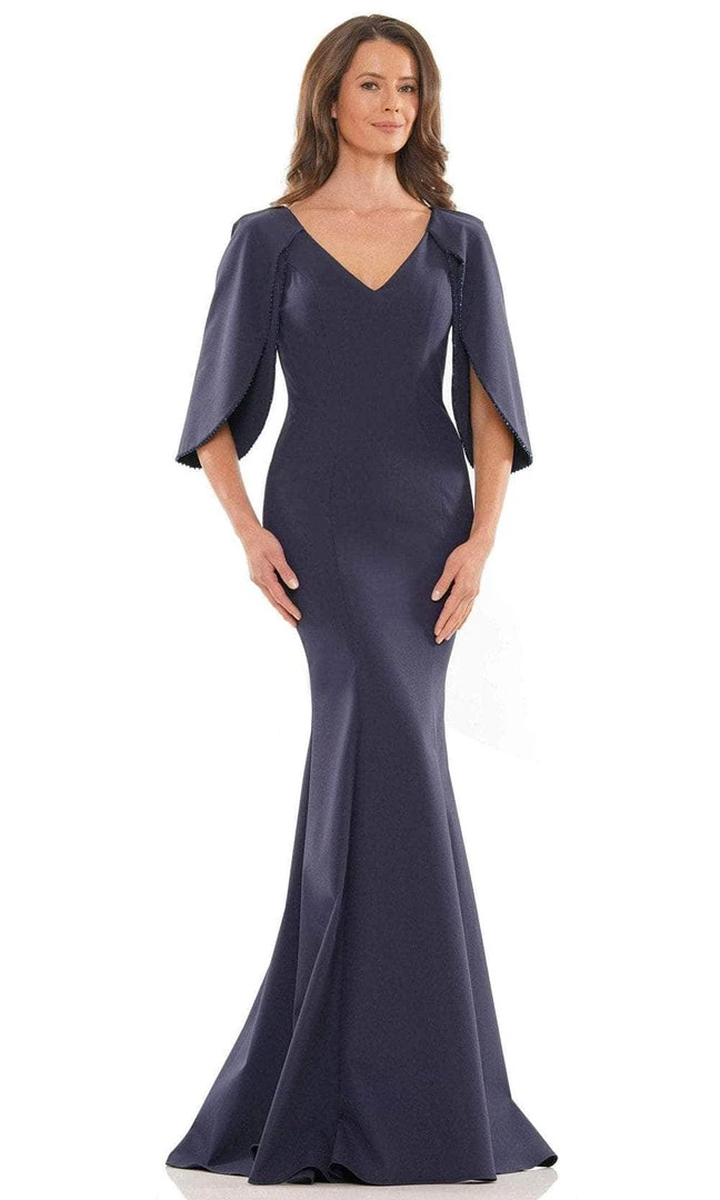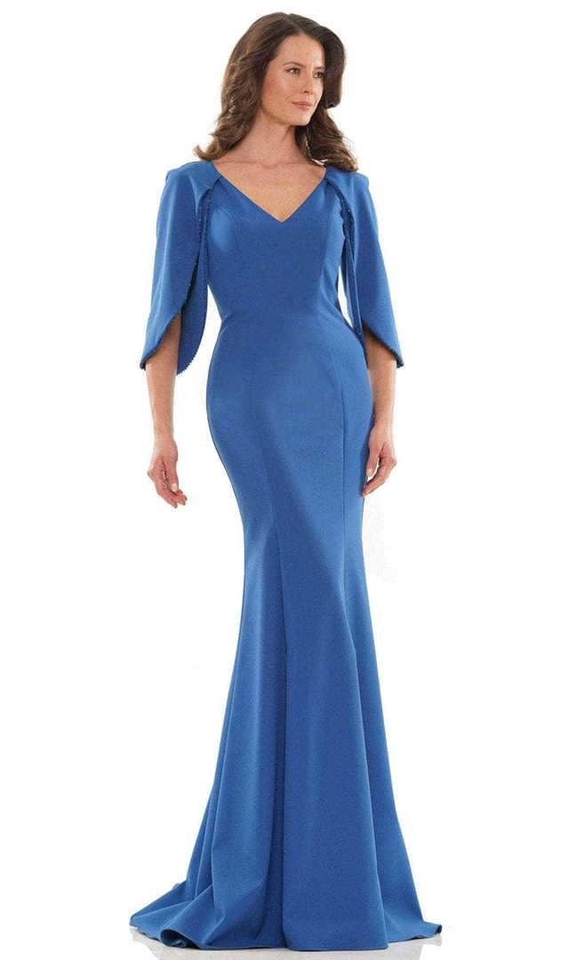 Be the center of attention in this glamorous Marsoni by Colors MV1159 evening gown. Elegantly crafted with tailoring seams accenting the fitted bodice, the gown features a deep V-neckline and split quarter-length cape sleeves with beaded trim. A full style with center zipper closure accents the back. The skirt fits along the hips and flares down into a full-length mermaid silhouette with a sweeping train. This Marsoni by Colors creation will sure to display your natural beauty and grace. Models are wearing the Emerald, Oxford Blue and Teal colors.