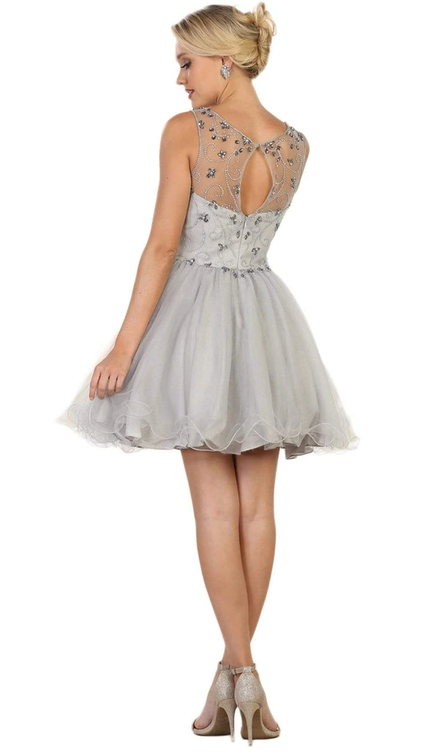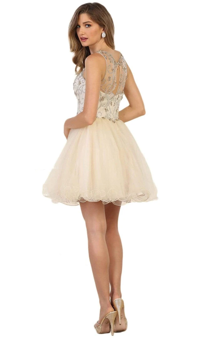 Instill your special evening with expressive style in this eloquent cocktail dress from May Queen MQ1555. The sleeveless bodice features an illusion bateau neckline over a sweetheart lined bodice. Intricate beads adorn the bodice for a sparkling effect while layers of tulle adorn the a-line skirt which cascades to a mid-thigh length finished off with a curled hemline. The sheer full back highlights a keyhole detail and a center zipper closure that ensure the perfect fitting of the dress. Sassy and stunning, this May Queen dress will have you dancing all night long!