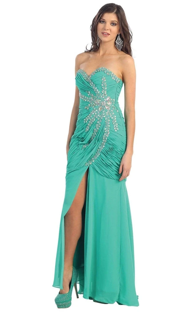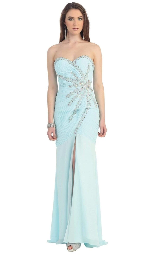 Make a statement with this gracious dress. This long strapless chiffon dress has a sweetheart neckline with multiple miniature pleats adorning a princess waistline. A hand beaded and sequin starburst design decorates the front of the dress. The chiffon skirt of the dress has a high split that accentuates the leg with each step, making it the perfect dress to wear to a homecoming or prom dance. The back of the dress is plain and there is a hidden zipper entry on the side of the dress. This is flawlessly tailored to fit your curves.