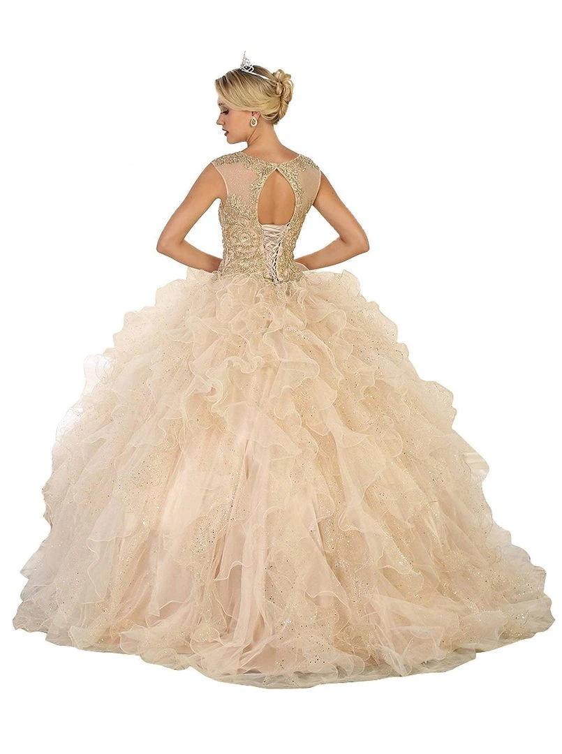 Bring out your inner princess in this gorgeous gown by May Queen LK104. It has a jewel neckline with cap sleeves and sheer bodice lavishly decked with gold embellishments. The back has a cutout and a lace up closure. From the basque waist flourishes the full length ruffled ballgown skirt. Look your absolute best in this May Queen gown and create a night that you’ll never forget.