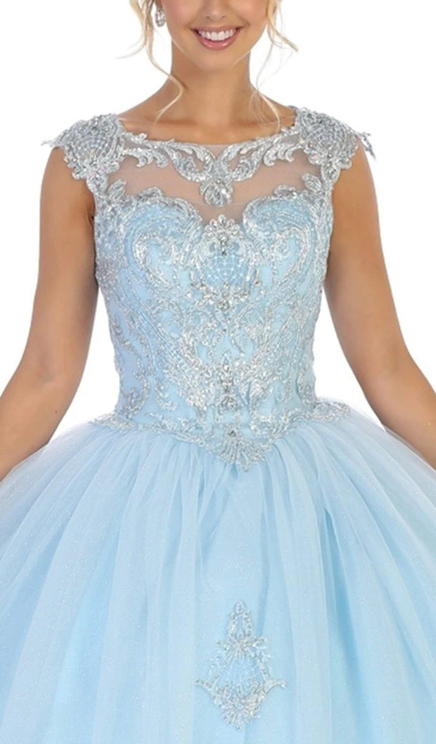 Stand out as you make your grand debut in this enchanting May Queen LK115 creation. Designed with an intricate lace spectacle accented with shimmering beads, this piece flaunts an illusion bateau neckline with framing cap sleeves. Crafted at the back with a cinching corset and an illusion cutout design, the voluminous skirt cascades from the ornate basque down to a lace appliqued ballgown silhouette. Dazzle all night long in this gorgeous May Queen masterpiece. Models are wearing the Baby Blue and Champagne colors.