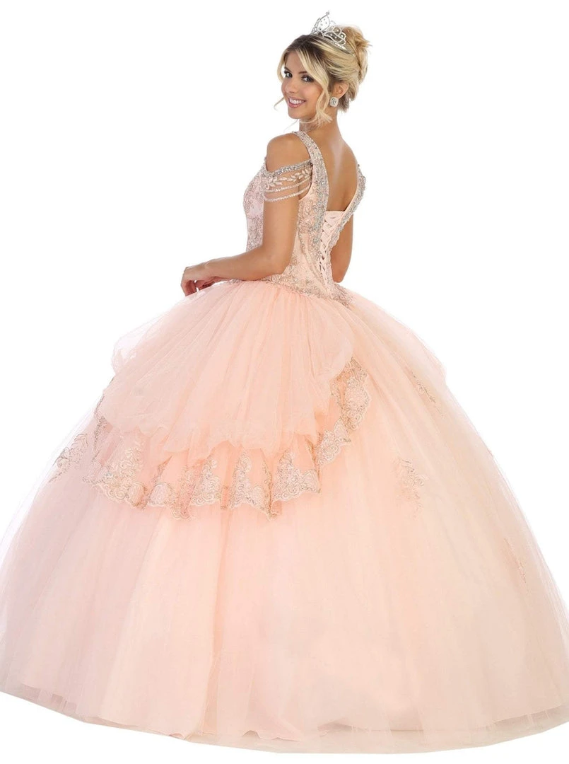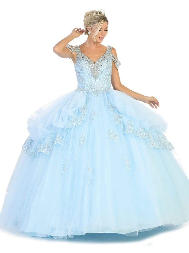Make them fall head over heels as you glow in this fascinating May Queen LK116 masterpiece. Beautifully detailed with jewels on a stunning lace spectacle, this delight shows a curving v-neckline accented with draping arm straps and a cold shoulder design. Crafted with a v-open back cinched with a corset detail, the appliqued skirt is designed with a puffed side peplum accent trimmed with scalloped lace as it touches the floor with a full-length voluminous hemline. Capture that stunning glow in this May Queen masterpiece. Models are wearing the Baby Blue, Blush and Champagne colors.