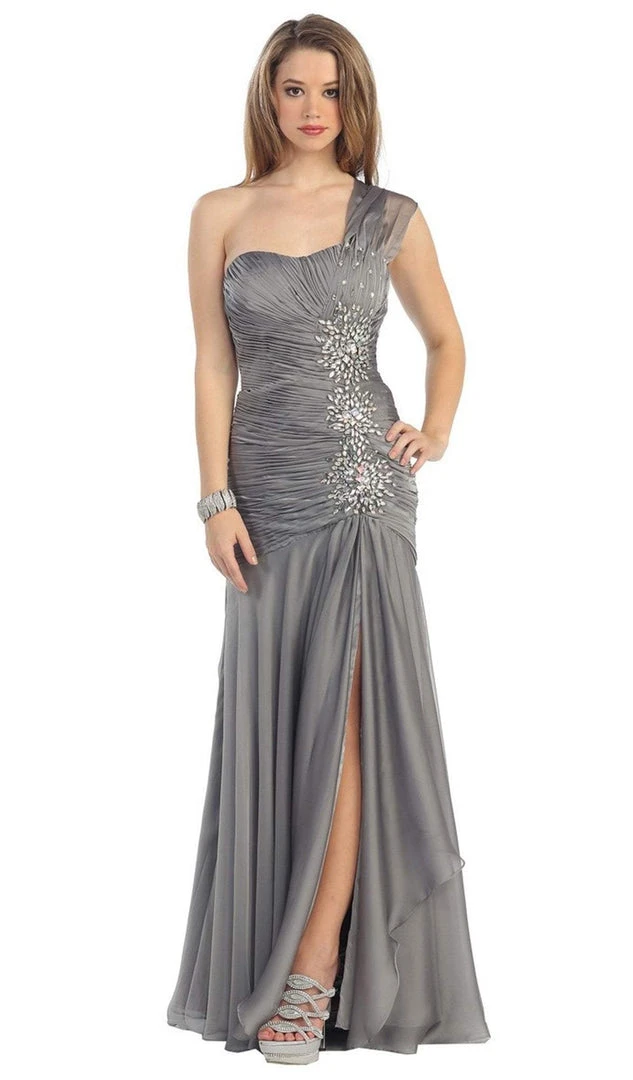 | Details: | One shoulder strap, Ruched bodice, Sleeveless, Jewel accent, A-line skirt, Pleated, Front slit skirt, Mid-open back, Back zip closure |