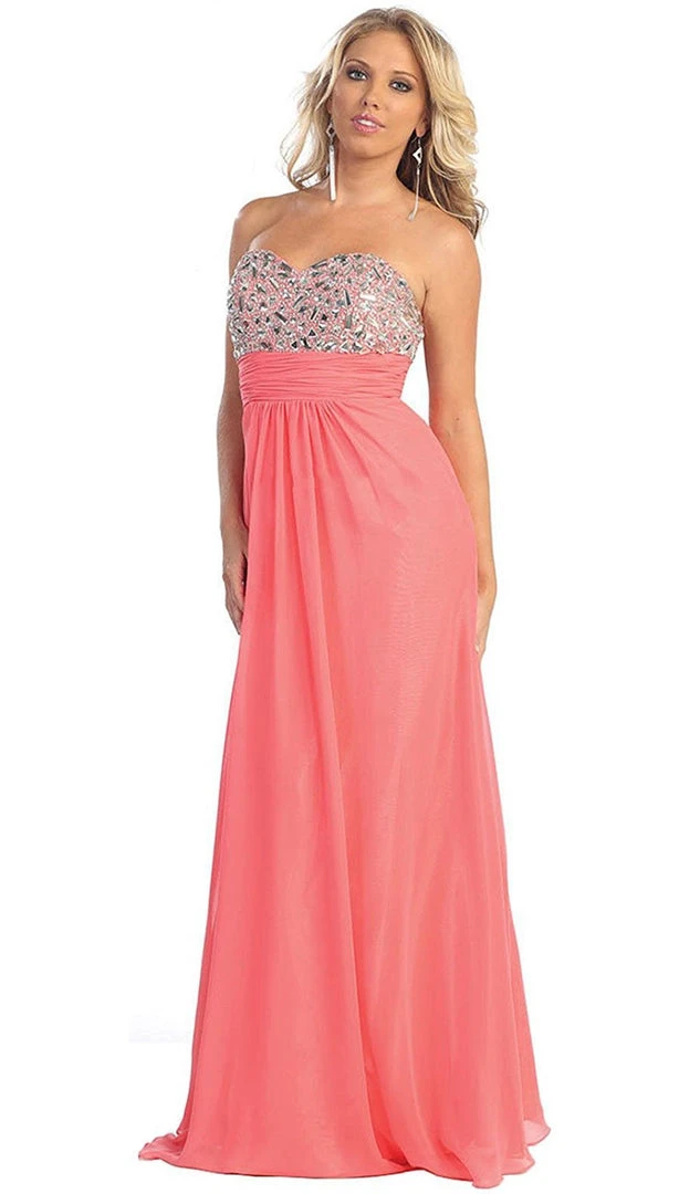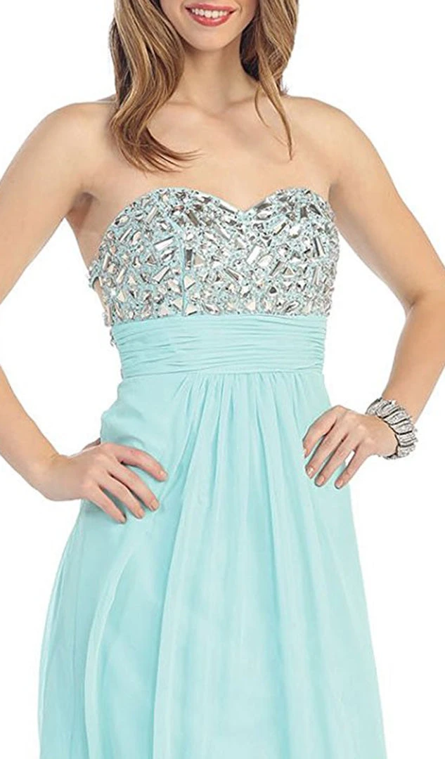 Be a woman of style and beauty in this classy A-line dress. Boasting a strapless, sweetheart neckline, this gorgeous piece showcases a bust with sparkling rhinestone accents that extends to the exquisite open back. The waist is cinched in a ruched band and flows into an full-length A-line skirt. This lavish dress is great for that upcoming prom and homecoming events.