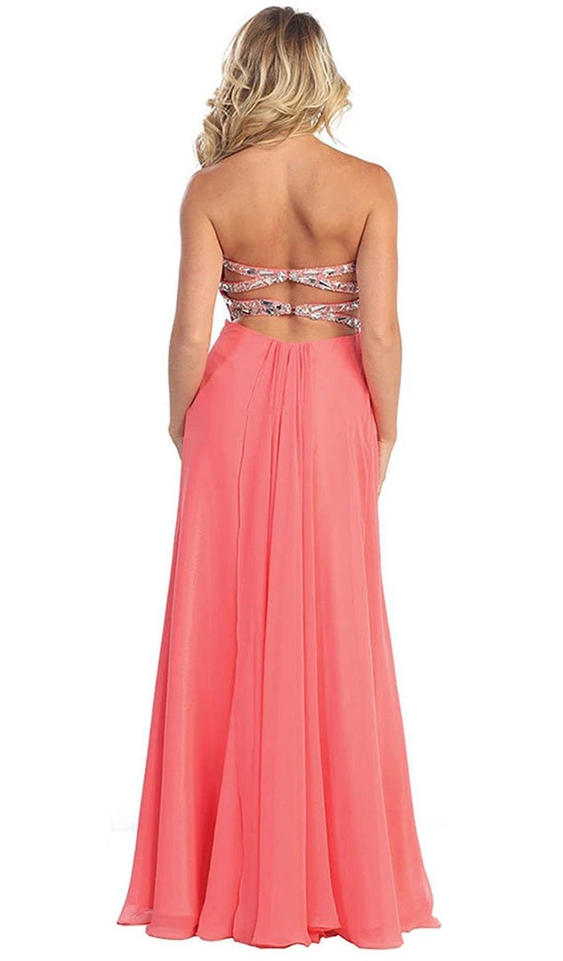 | Details: | Strapless, Rhinestones, Ruched waistband, A-line skirt, Strappy open back |