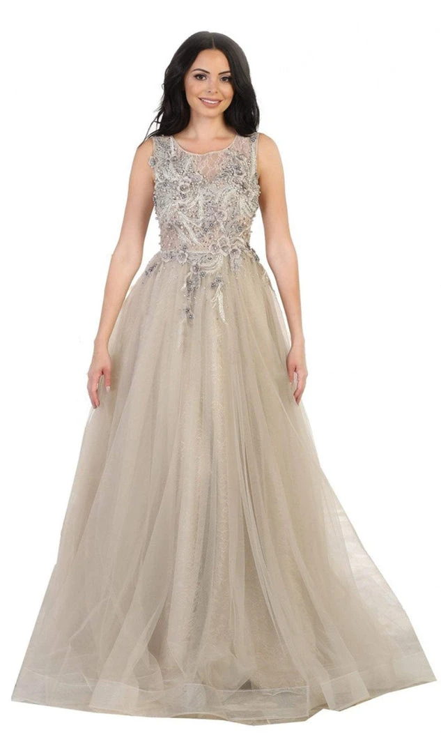 Get ready to wow the crowd wearing this evening gown by May Queen RQ7527. The dress showcases a sleeveless bodice with scoop neckline. The bodice is sheer with pearl and floral applique embellishment. The skirt is layered and flares to a ballgown silhouette with lovely sweep train. Wear this May Queen dress to prom, pageant, gala, or your next evening party!