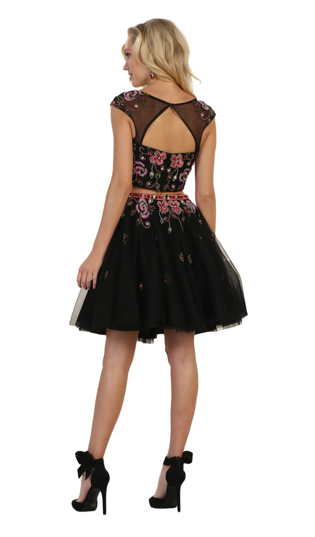 Get ready to be captured in picture of sophistication in this ensemble by May Queen RQ7559. This two piece dress features an illusion bateau neckline crop top with cap sleeves and sweetheart lined bodice designed with colorful embellishments and an open back. The skirt flares in a flirty A-line silhouette and runs at mid-thigh hem. This stunning short May Queen dress brings together all the essentials for a great look at prom or party!