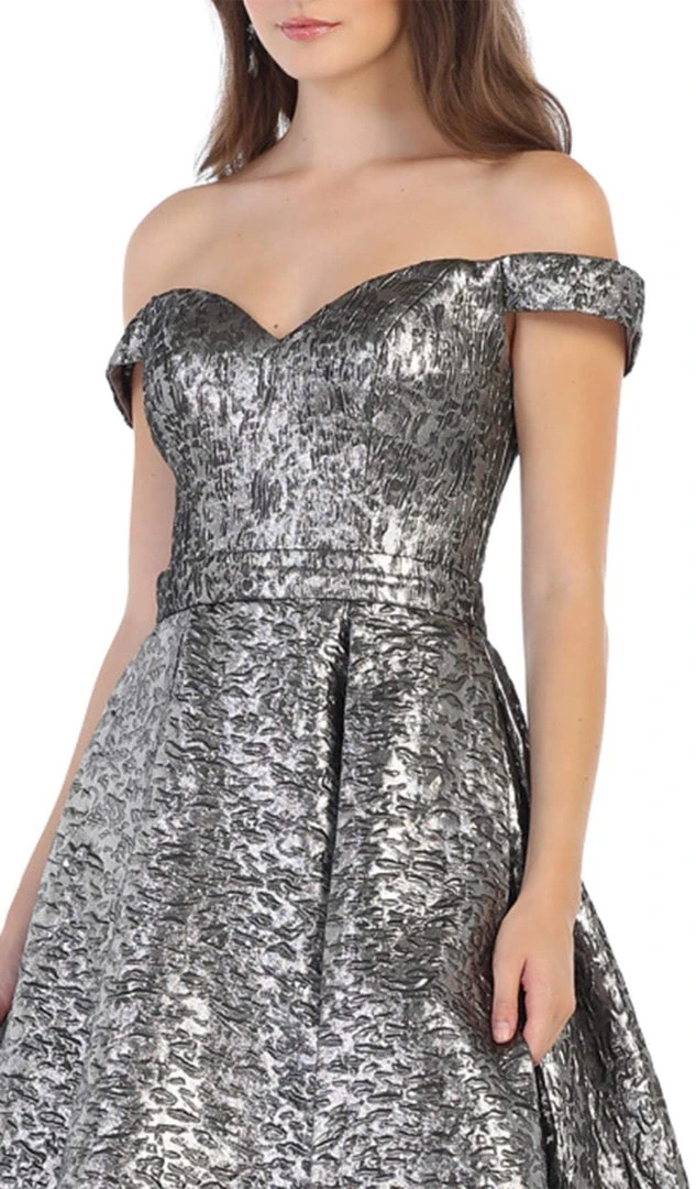Wow the crowd as you walk in this stunning gown from May Queen RQ7704. Glams in an off the shoulder neckline with fitted bodice wrapped in a thin band. The back has a lace up closure while the pleated skirt opens in a ballgown silhouette with a sweep train finish. You are sure to make an entrance in this elegant gown from May Queen. Model is wearing Silver color.