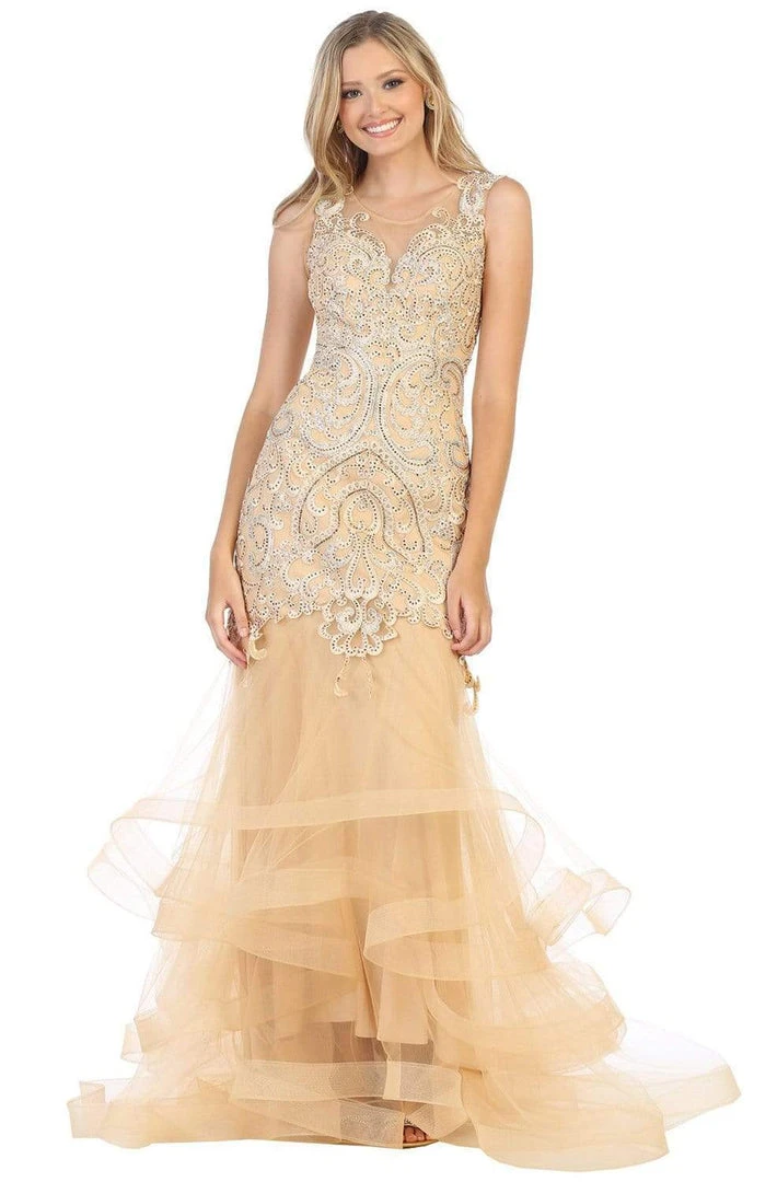 Look stunning in this vogue dress by May Queen RQ7778. Showcases a sleeveless, scoop neckline with fitted bodice detailed with beautiful embroidery. The back has a zipper closure while the ruffled trumpet skirt finishes in a horsehair hemline. This May Queen dress is sure to make you the darling of the party!