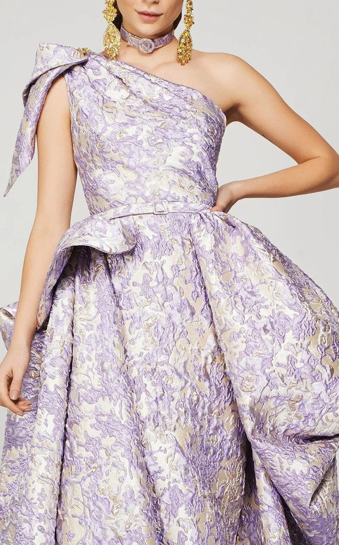 Be fabulous in this creation by MNM Couture 2374. The asymmetrical neckline has a single shoulder strap with chic tied details and has a playful peplum at one side creating a unique and stunning look. Romantic and noble, this gorgeous ensemble cascades to the full-length hem in luxuriously draped and shimmering brocade waves. This MNM Couture style is a sure standout on your next evening social event. Model is wearing Purple color.
