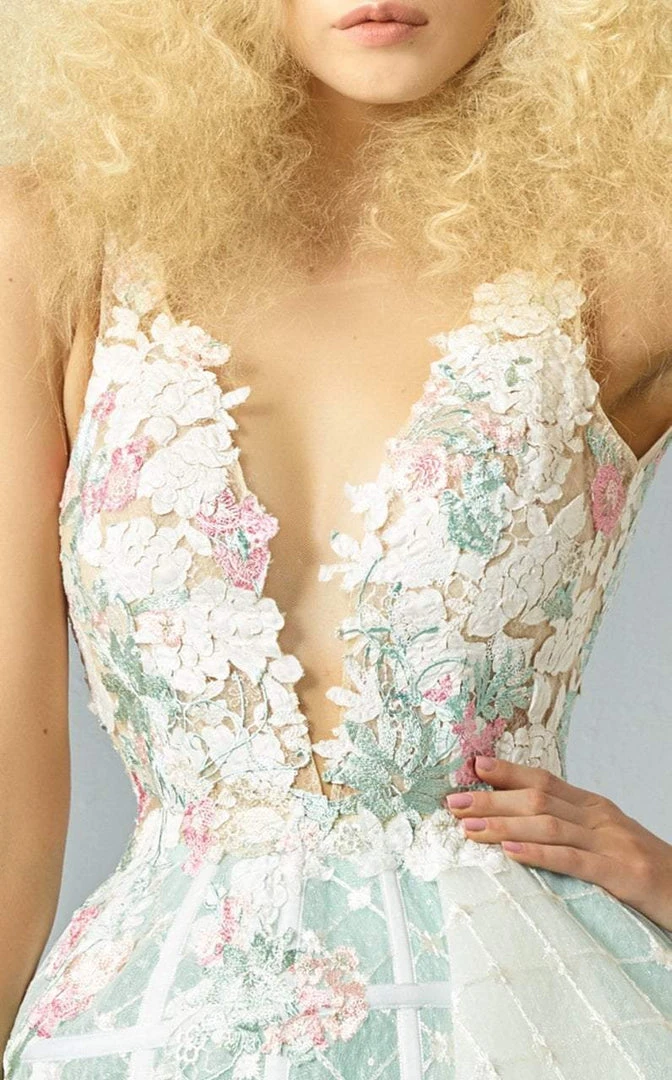 Walk on the red carpet with a majestic poise as you don this fantastically embellished MNM Couture G0885 creation. Tailored with lovely lattice textured fabric, this charming piece flourishes a plunging v-neckline paired with a wide v-cut open back on a sleeveless bodice. Beautifully appliqued with mellow blossoms, this ensemble shows a boned peplum detail that cascades along with its full-length mermaid skirt. Ensconce yourself in lovely colors as you beam with elegance in this MNM Couture masterpiece. Model is wearing the Mint color.
