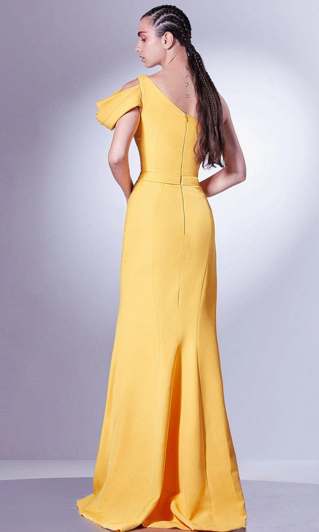 Illuminate the night in this exceptional MNM Couture G1342 creation. Crafted in a sultry crepe silhouette, this gown flatters with an asymmetrical bodice with a draping sash and a cold shoulder detail. Cinched at the waist with diagonal seams, a high slit opens the mermaid silhouette as it ends with a train. Set yourself apart from the crowd in this MNM Couture masterpiece. Each of MNM Couture design offers cutting edge styles that will make every woman look sophisticated Model is wearing the Yellow color.