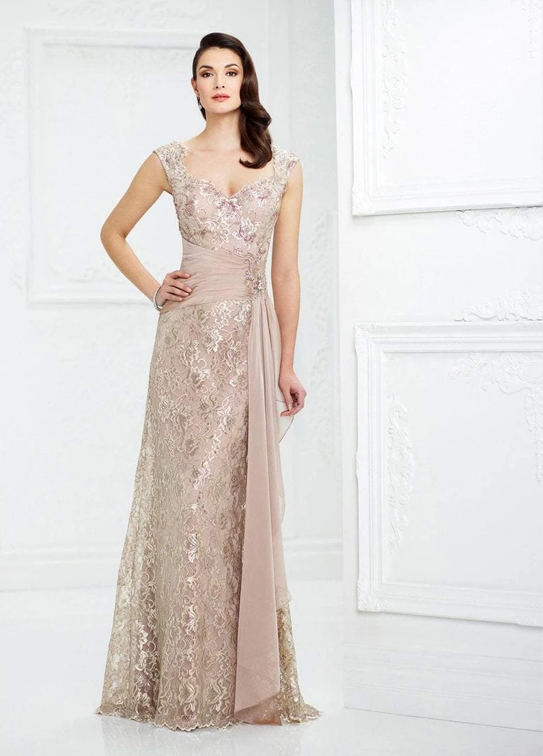 Lavishly embellished with twinkling beads along its metallic lace fabric, this gorgeous piece flaunts a classy Queen Anne neckline that translates a pair of chic cap sleeves and a v-shaped open back. Elegantly enfolded with a pleated asymmetrical waistband with an off-center intricate beadwork, the sheath skirt flows down along its ruffle draped panel down to a scalloped full-length hem and a sweep of train.