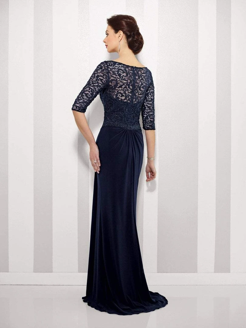 Fall in love in this romantic Cameron Blake by Mon Cheri dress. This style 216695 features a jersey sheath with hand-beaded and lace illusion three-quarter length sleeves. This stunning gown has a bateau neckline over a sweetheart bodice, a beaded asymmetrical waistline, a lace illusion back, a side draped skirt with side slit, and sweep train. This Mon Cheri dress is a very elegant choice for your momentous occasion.