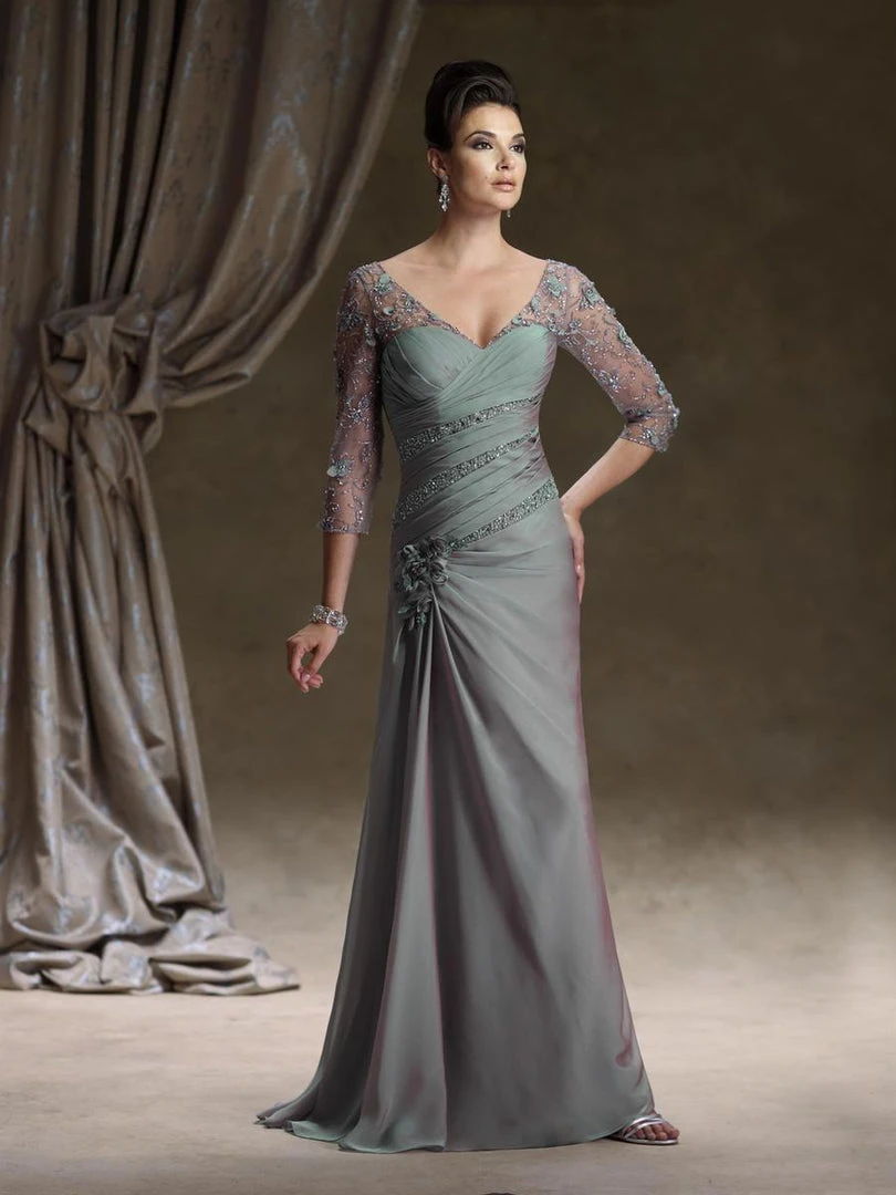 Iridescent chiffon A-line dress with hand-beaded illusion three-quarter length sleeves and V-neckline, back beaded illusion bodice with keyhole, side gathered sweetheart bodice features asymmetrical hand-beaded trim, asymmetrically dropped waistline adorned with side hand-crafted flower, soft side draped skirt.