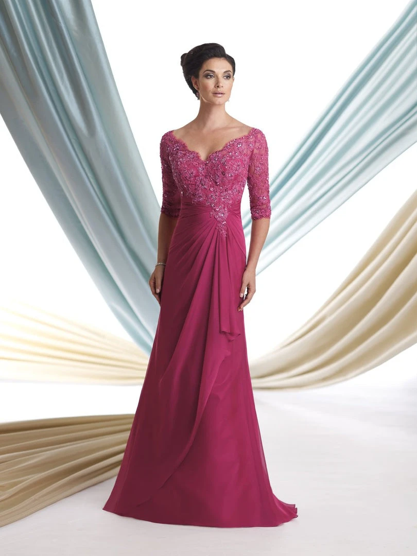 Two-tone chiffon mock-wrap A-line gown with hand-beaded embroidered lace three-quarter length sleeves, scalloped tip-of-the-shoulder V-neckline, lace empire bodice, keyhole back, side gathered skirt with cascading ruffle, sweep train.