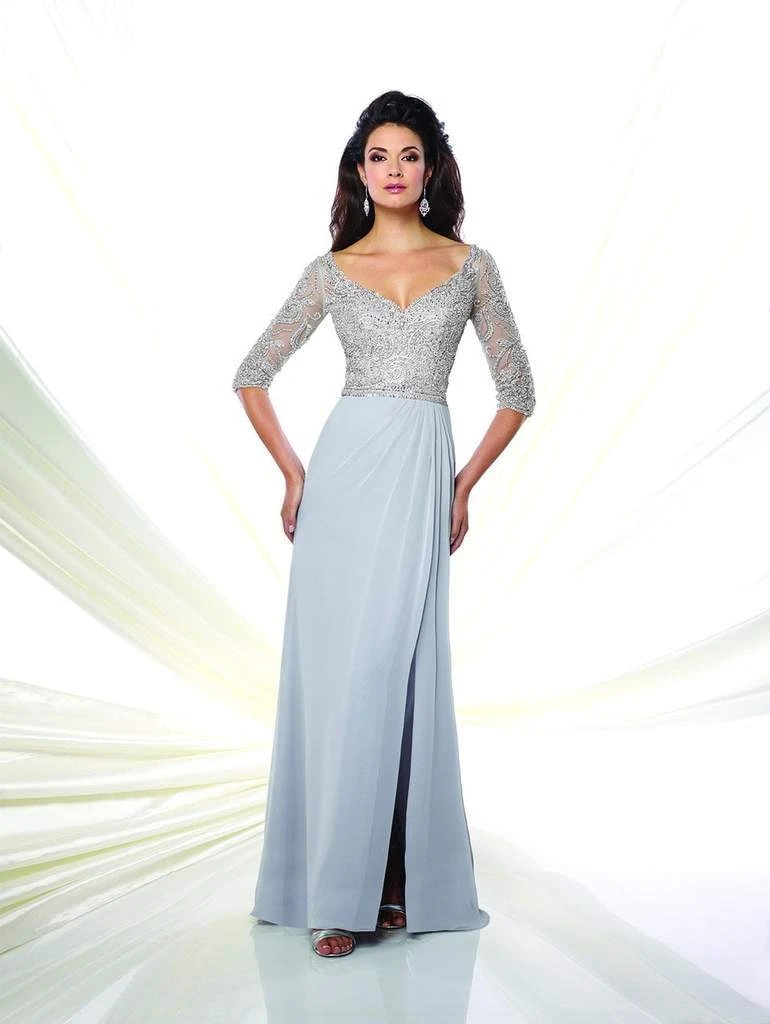 Chiffon sheath with hand-beaded illusion three-quarter length sleeves, tip-of-the-shoulder V-neckline, beaded bodice with beaded illusion back, side draped skirt with side slit and sweep train.