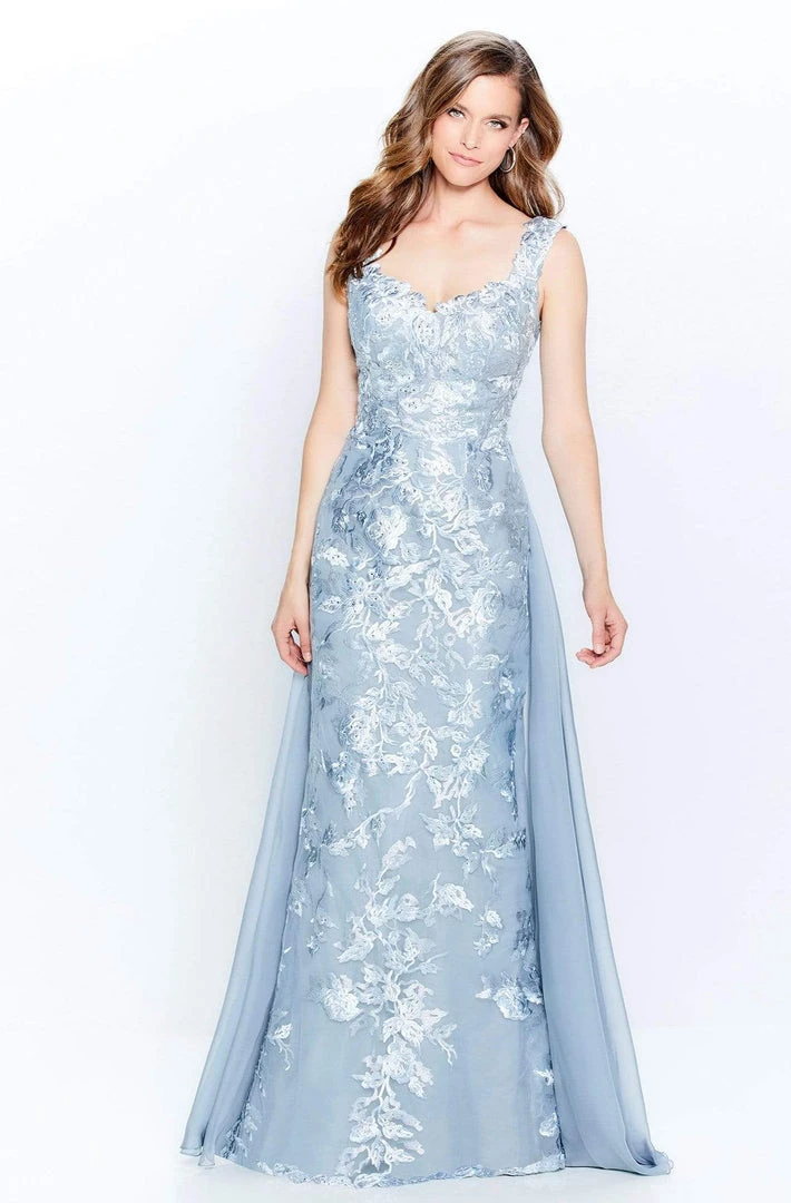 Infuse your special event with stellar style in this Montage by Mon Cheri 120918. This embroidered lace dress showcases a sleeveless, V-neckline with separate quarter length sleeves. The fitted bodice has a scoop back the sheath skirt is complemented with a detachable train. Get the party started in this spectacular evening dress from Montage by Mon Cheri. Model is wearing Blue Pearl color.