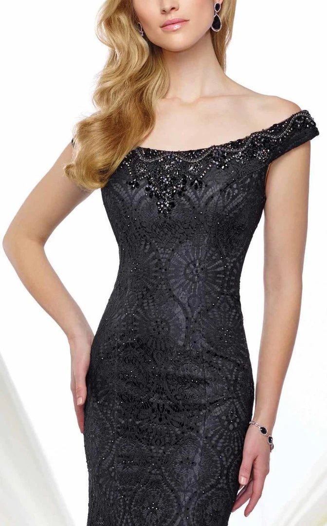 Tip-of-the-shoulder lace mermaid dress with allover scattered light hand-beading, front and back wide scoop necklines trimmed with jewel beading, sweep train. Matching shawl included.
